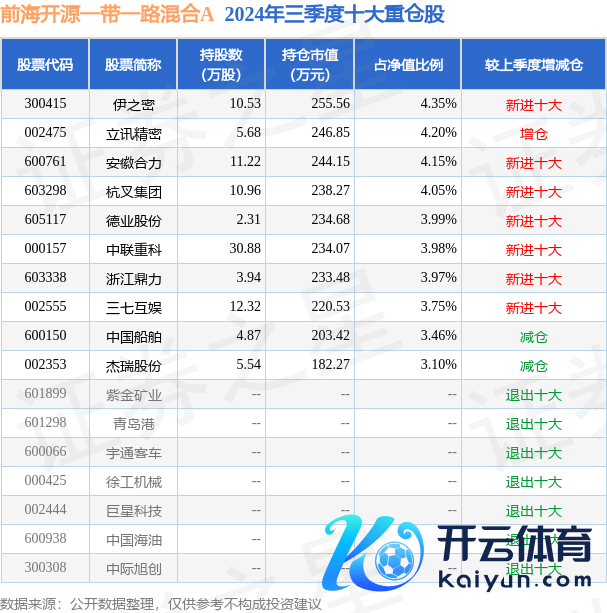 前海开源一带通盘羼杂A为羼杂型-活泼基金,凭据最新一期基金季报透露,该基金金钱成立:股票占净值比92.36%,无债券类金钱,现款占净值比7.75%。基金十大重仓股如下: